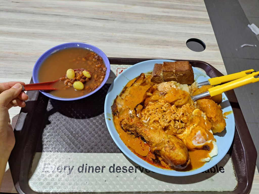 坐下, 却觉得位子不干净, 不能好好放下包包放松吃。 转个头找了个位子坐下, 享受我每一口咖喱卤肉饭, 配几口红豆糖水。