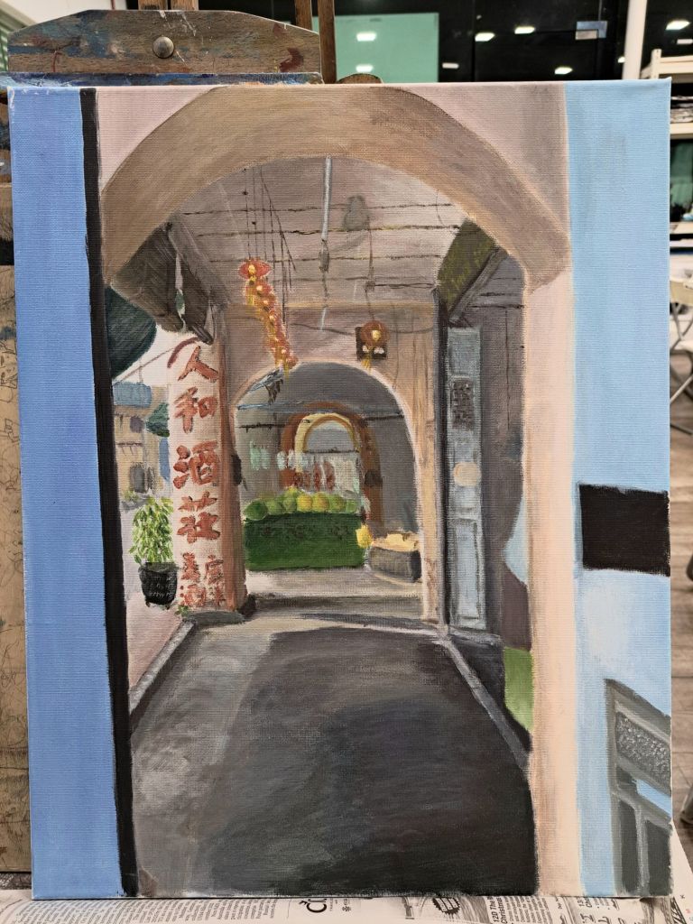 再一次直视我的画, 思考思考哪里可以改善, 整体的颜色关系, 我忽略了哪里的细节。 放大放小。 胡说八道称赞我的人和酒荘柱子 说颜色渐变处理得不错。 谢谢, 听了是开心, 哈哈但是我也好奇哪里可以改善。 提出了边不整齐,可以看到白白的边界痕迹。 建议我加点点点水和颜料修边。