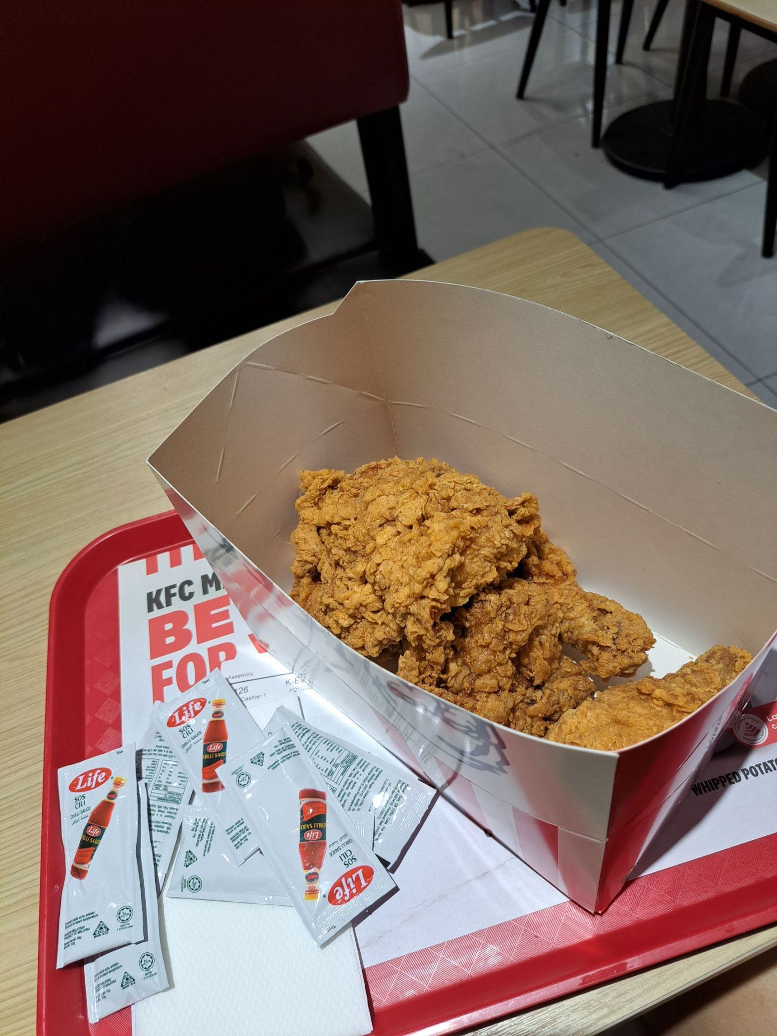 过后我找到了KFC, 下单了$9.95 的快乐。 上个厕所洗个手回来, Hi, is this 126? the 5pcs chicken。 其实答案很明显, 只有我是新的顾客。托盘上只有纸盒没有水没有马铃薯泥/coleslaw。和员工确认了, 我就拎走我的快乐。woah, 鸡肉是刚炸好的, 烧烧的。 这就是快关门才来的幸运。 炸鸡大片和脆!配上一包又一包的辣椒, 搭配刚刚好。 一切都好。
